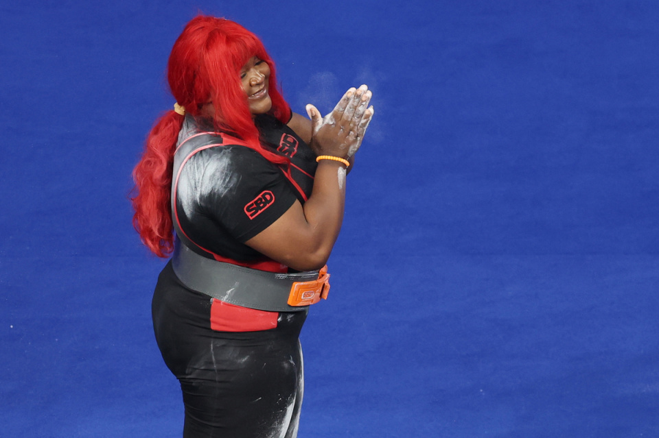 南非选手Faul Megan在硬举比赛中庆祝试举成功。中国日报记者 魏晓昊 摄